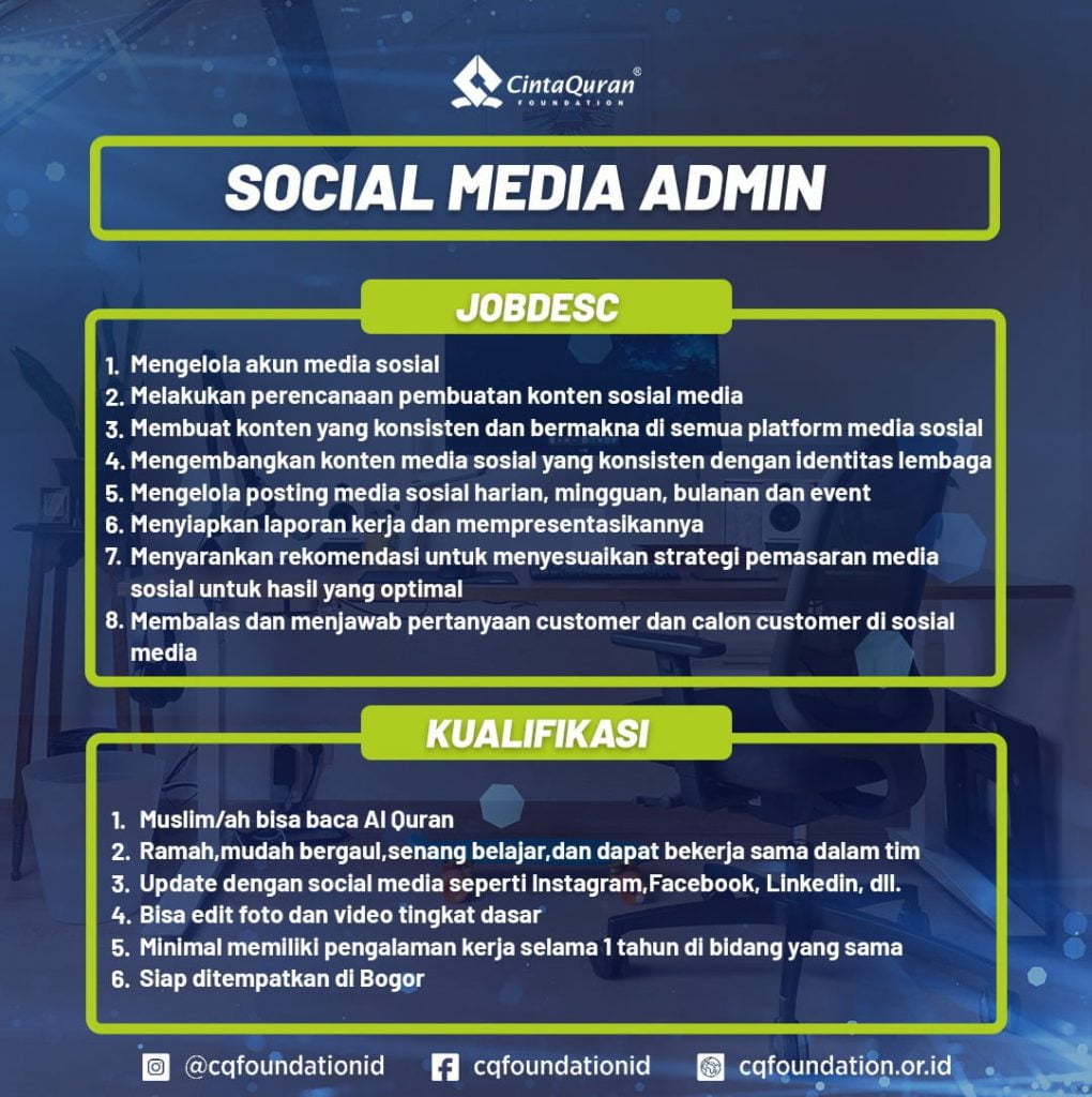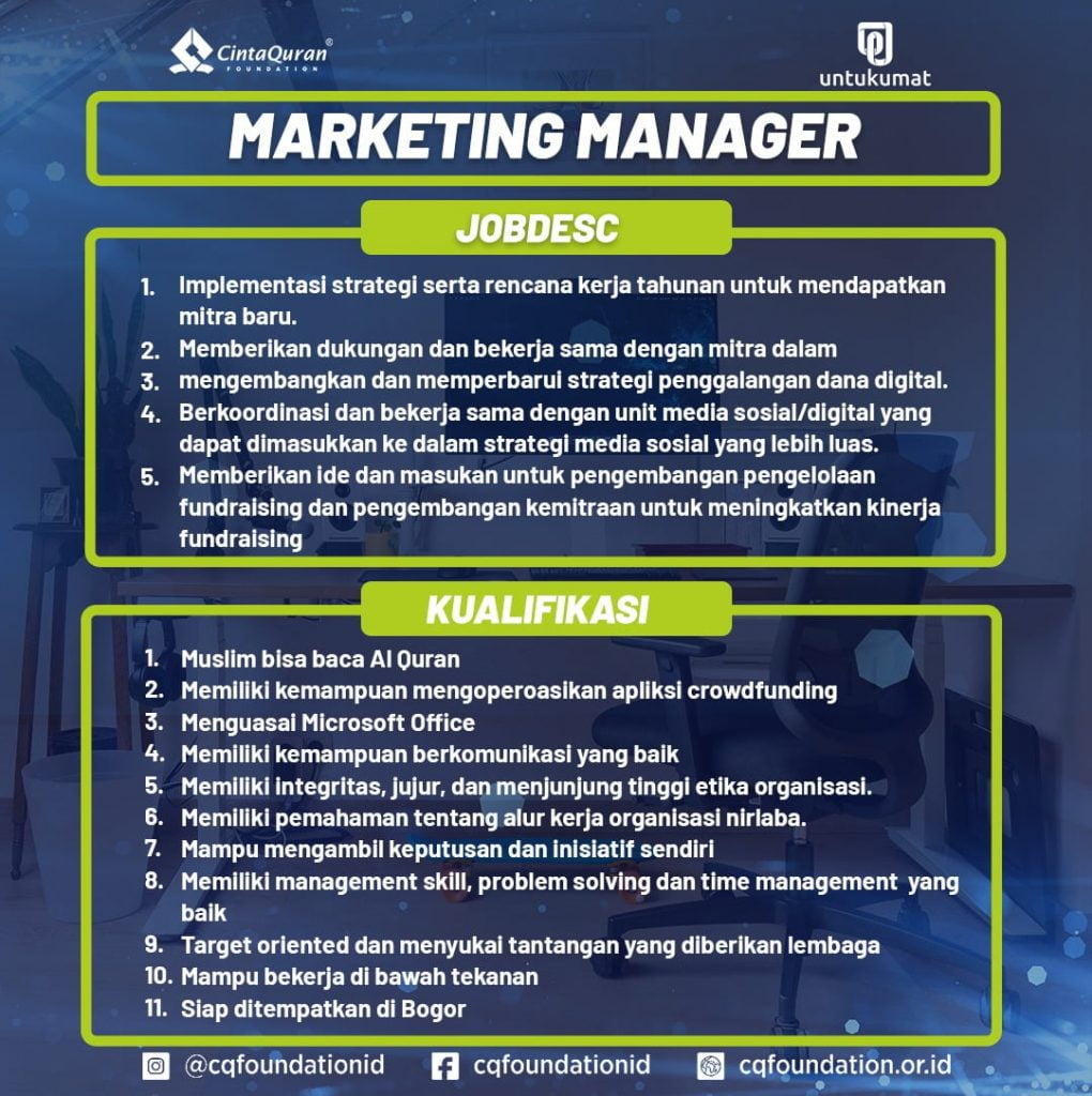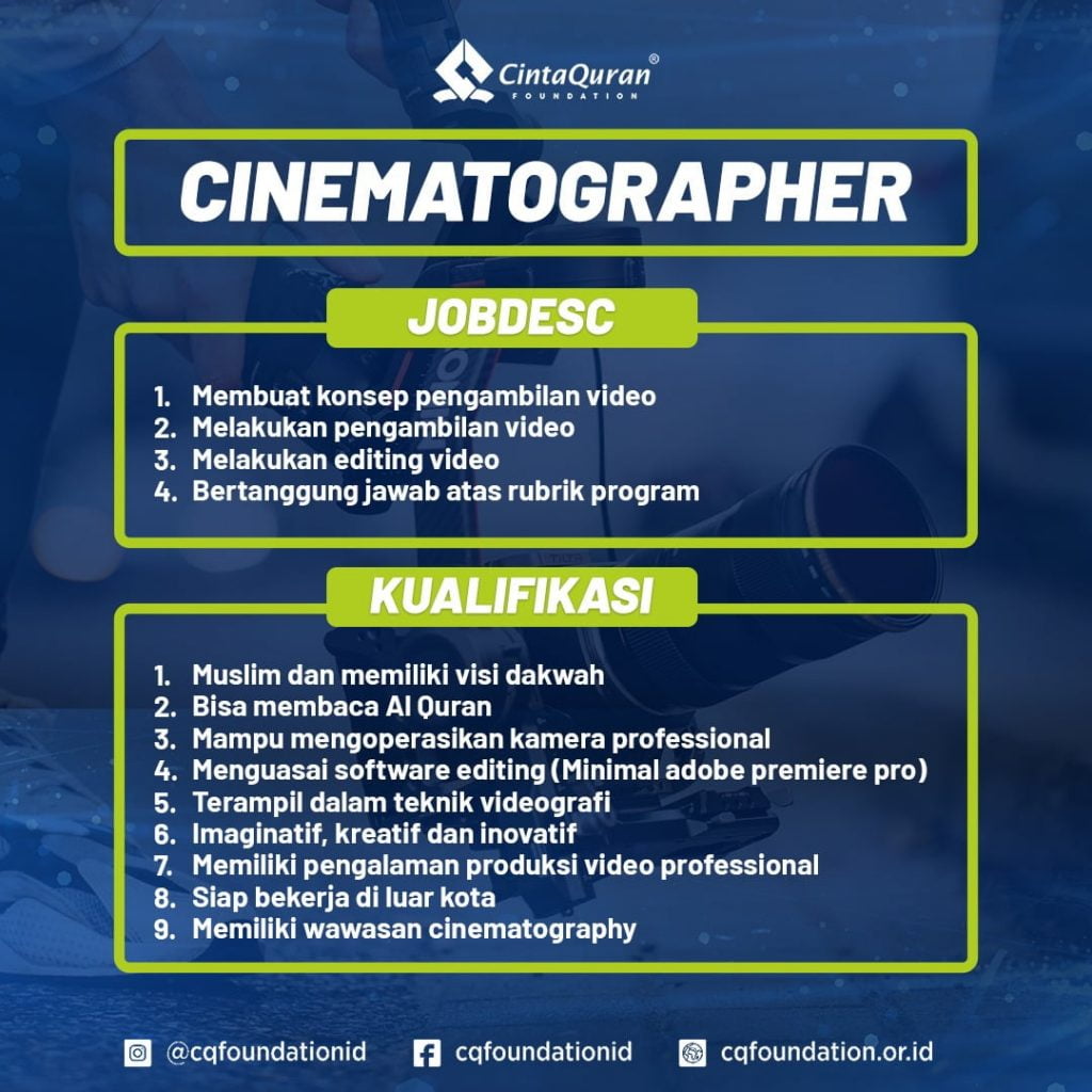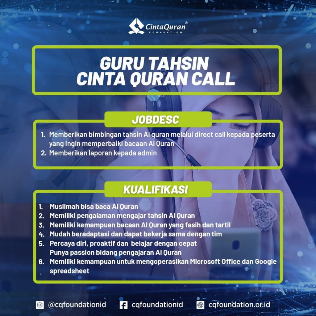 Berikut adalah posisi serta jobdesk dan kualifikasi yang dibutuhkan di Cinta Quran Foundation