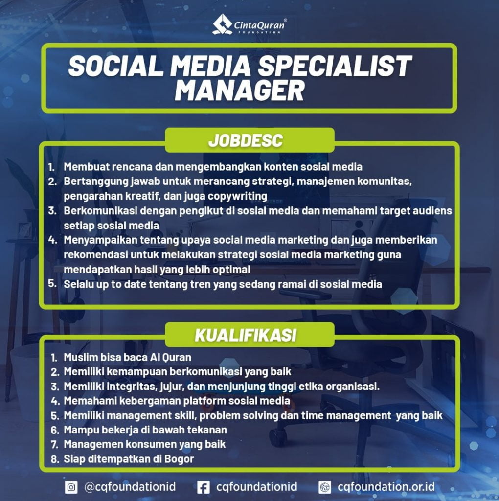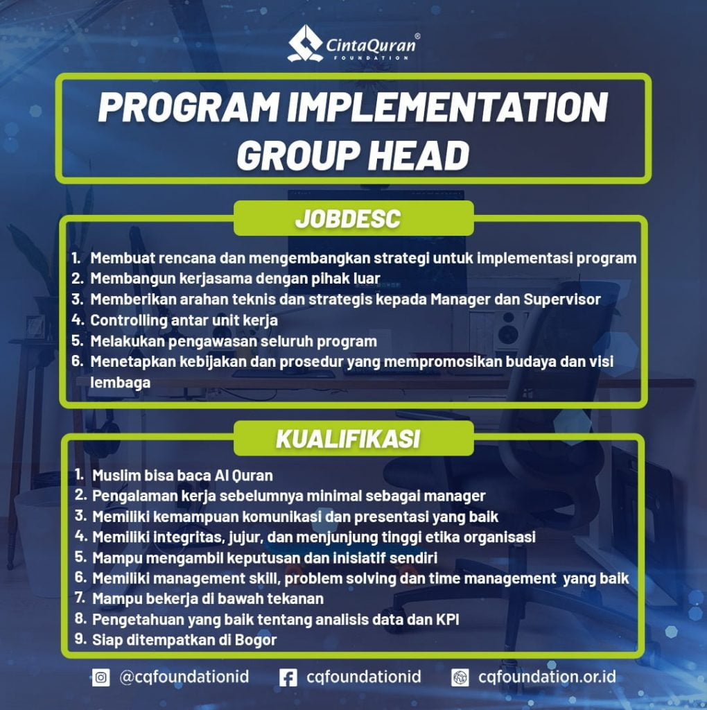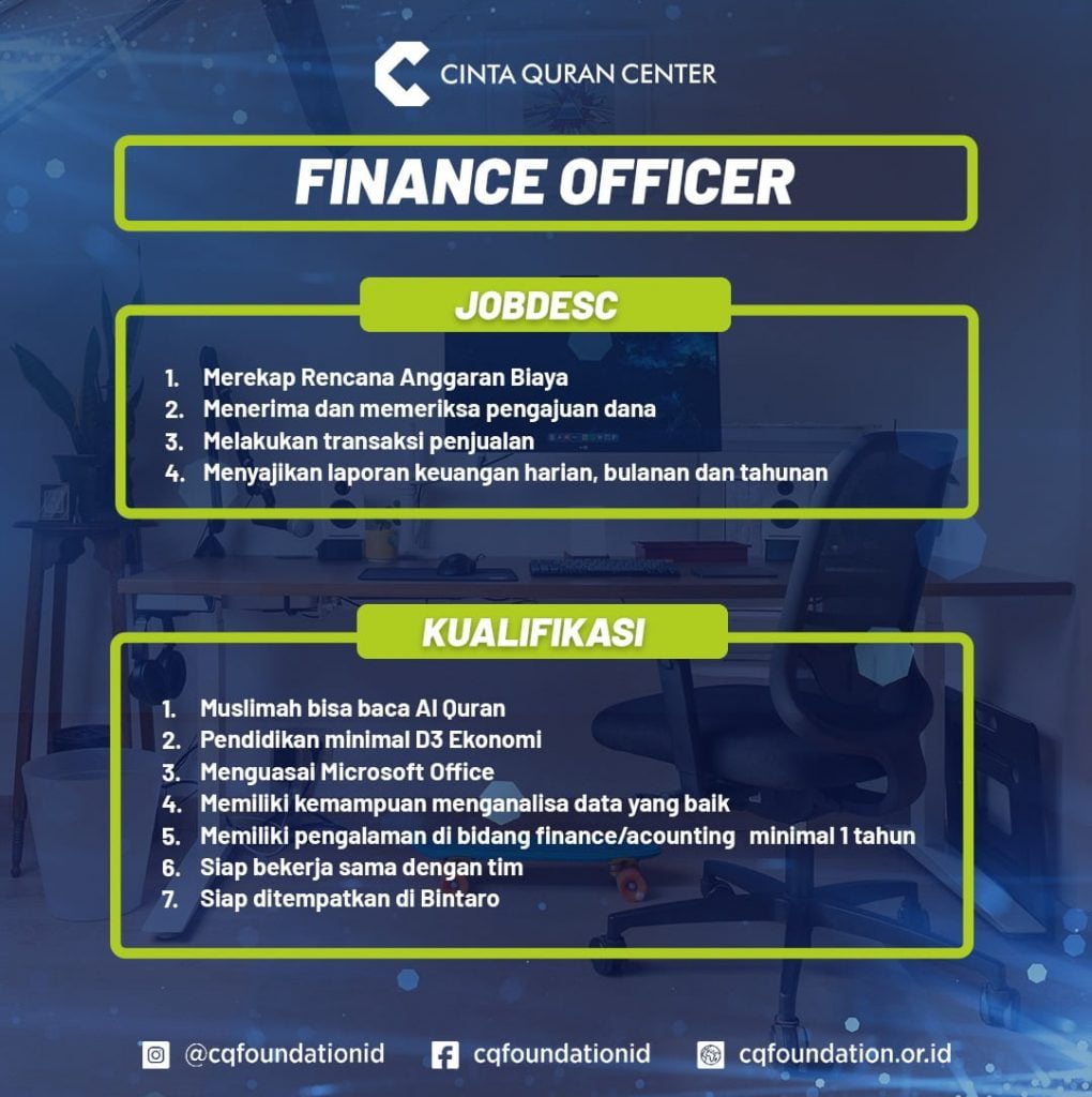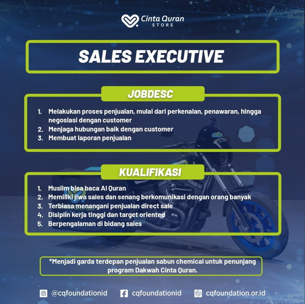Berikut adalah posisi serta jobdesk dan kualifikasi yang dibutuhkan di Cinta Quran Foundation