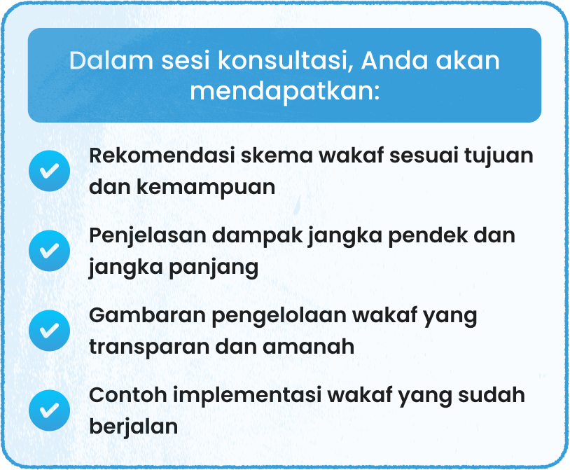 Melalui layanan Konsultasi Wakaf, kami membantu Anda memahami wakaf secara utuh: dari niat, skema, hingga dampak nyatanya.